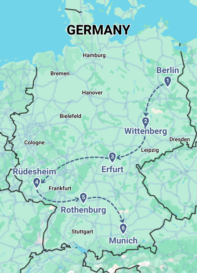 • Cities: Berlin, Wittenberg, Eisleben, Erfurt, Eisenach, Rudesheim, Rothenburg, Neuschwanstein, Munich